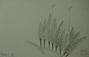 在山上住過的人都清楚,低海拔的地方下雨,越往山裏去雨勢會越大,果然,遊覽車上到陽明山公園的花鐘停車場後,老天爺連下車的機會都不給一點,本想等等看雨勢會不會稍為減弱些,約莫十分鐘過去,我們巴望的眼神顯然沒有打動上天,失望中,我卻找到一個快樂的點,專心地畫了起來,畫完才回神車內的點滴情況,孩子們對這場雨似乎不太在意,倒是對校外教學的零食情有獨鍾,我送了一個微笑給大家,同時也收到好多個天真的微笑。