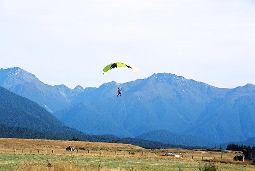 一大早離開Te Anau往Queenstown前進,路上看到羊群過馬路了,只見一大群羊把路都佔滿了,牧羊人忙著帶路和驅趕,幾隻狗則負責把脫隊的羊隻趕回隊伍,還好我們不趕時間,就停下車慢慢看吧,其他車輛駕駛有沒有罵在心裡我就不知了.還沒進到Queenstown就看到天上不時有降落傘飄落,近距離看還是兩個人綁在一起跳的,想必就是雙人跳傘,即教練帶著遊客一起跳,連教都不用教了.