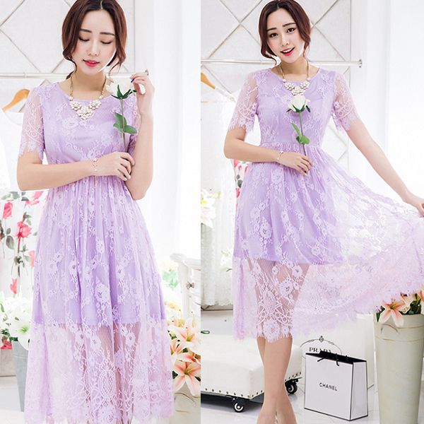 【資料來源 / 版權 與 商品購買網址】灰姑娘[98482-QF]*圓領蕾絲花朵顯腰修身短袖洋裝~
