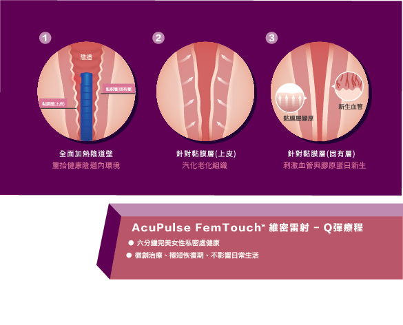 全台率先通過L類婦科雷射的FemTouch(俗稱維密雷射)幾乎無痛陰道雷射可以同步解決私密處乾澀問題、私密處老化與輕度與中度應力性漏尿等問題,治療時間僅需數分鐘,透過雷射光熱效應刺激膠原蛋白增生,有助增厚陰道壁,陰道壁也會因為受熱刺激新生膠原蛋白增生,使結締組織更健康,陰道環境變得更健康後,除了解決乾澀、白帶、異味等問題也可以用以改善漏尿問題,甚至私密處顏色、外型都會因為新生膠原蛋白的滋潤而變得更澎潤、緊實、Q彈。陰道彈性變好,愛愛時自然不再乾巴巴,也不會疼痛難忍,短時間內就能找回遺失的性福感!