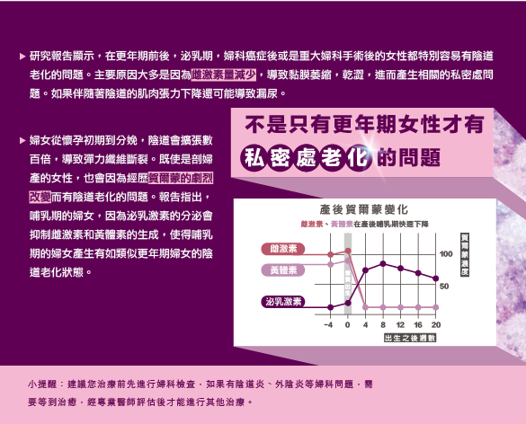 多數女性在45-55歲這個階段常出現生殖泌尿道症候群,原因出在女性荷爾蒙缺乏,所以引發一連串效應,因為膀胱、尿道、陰道表皮細胞萎縮、變薄,膠原蛋白急速流失,以及骨盆支撐度變差、陰道粘膜乾澀,時不時陰道乾澀、疼痛,或出現灼熱感、出血,讓人坐立難安,有時外陰部還會出現搔癢、明顯白帶,或者因為陰道搔癢乾澀,不只是在日常生活造成困擾,也讓性生活成為一種酷刑。