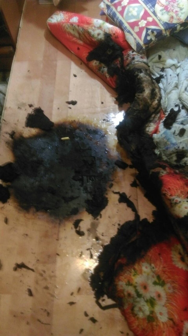 葛男疑抽菸不慎引燃棉被,燃燒面積約1平方公尺。(記者黃捷翻攝)2016-08-3113:09