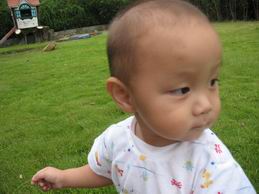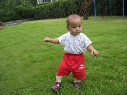 今天讓他在小區的草原玩,又忍不住拍他可愛的笑容啦~~現在走的很不錯了哦~