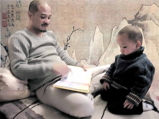 這頁首父讀子閱的情境(這因為是睡前說故事時間,請大家忽略過睡衣...)