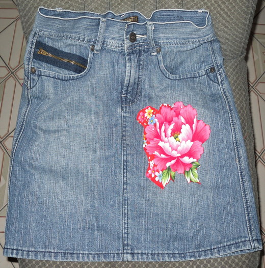 我把現在最流行的台灣花布截取大朵紅花拿來縫在上面。