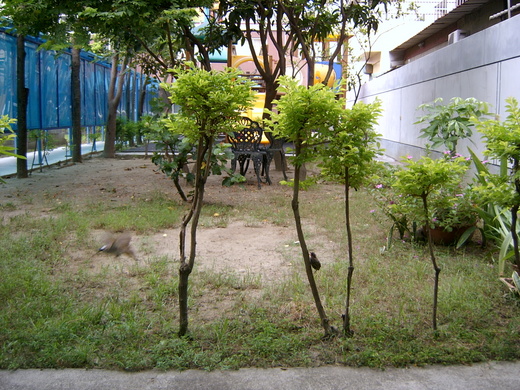 小小鳥在學飛,所以飛不高飛不遠,差一點就被廚房媽媽捉了回家,幸好,她放棄了念頭,我將牠放回離牠鳥巢不遠處,隨之,就聽見鳥爸爸鳥媽媽急促的叫聲,在高處不時的呼叫著,可想而知牠們是多麼的焦慮孩子不見了並擔心其安危,牠們並沒有立刻飛到小小鳥的身旁,或許牠們很聰明,懂得保護自身的安危,小小鳥一直停在原位,並沒有因為聽到呼叫聲而有所動靜,我則一直等到成鳥飛到小小鳥身旁才離去。