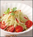 ●材 料:青木瓜 250公克,小蕃茄 6顆,蝦米 10公克,薑末 5公克,蒜末 5公克,辣椒絲 10公克,熟花生 適量