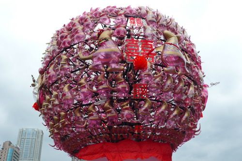 白天看到的花燈,果然與網友史瑞克先生夜晚拍的感覺迥然不同.夜晚的花燈還是較美.白天唯一的好處是可以很清楚的看清它的原貌.主燈的老鼠氣球原來是紫紅色的啊!