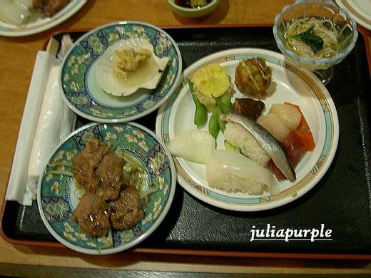 在中午時分抵達了洞爺湖畔的一家飯店用餐.午餐享用的是"鮭魚的一生":從鮭魚子到鮭魚肉片,炸鮭魚,鮭魚鬆.......真是吃足了!用鮭魚子和鮭魚鬆拌飯還真好吃,這是這次旅行第一次把飯吃光光...