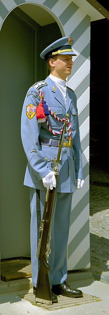 走到城堡區底是東門,這裡也有帥帥的捷克士兵站崗,趕快和不茍言笑的他