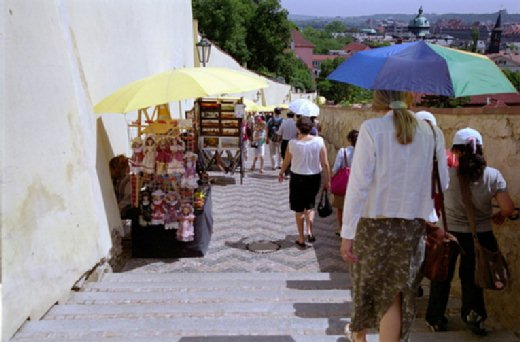 沿著階梯又有一些賣紀念品的娃娃和圖畫的小攤子,再沿著舊登城道下去就可以接到伏爾塔瓦河邊了.