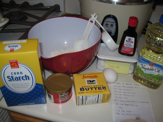 看完食譜後開始找材料才發現家裡只有脫脂牛奶,香草精也不夠,放在櫃子的玉米粉6年前就到期了(那天得花時間清清櫃子,看看到底還有什麼古董在裡面).外子還穿著睡袍,鳴~看樣子,要吃老娘就得出門一趟了.