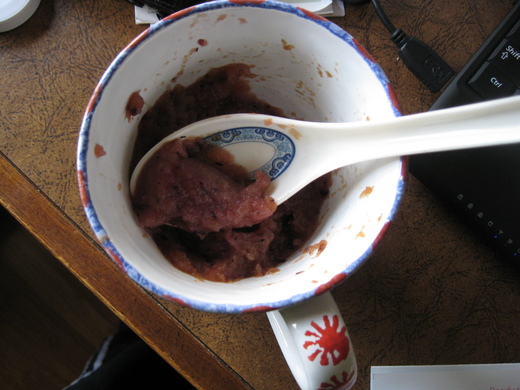 今天的食譜是蘋果泥(4個蘋果+半杯藍莓+少少的肉桂粉).蘋果泥我向來不喜歡,又像嬰兒食物.大概是肚子餓了吧,不過今天吃起來好好吃哦!再次體會到了天然口味.但是我想晚上還是會燙一些青菜來補充體力.一天沒吃到青菜會很難過的.