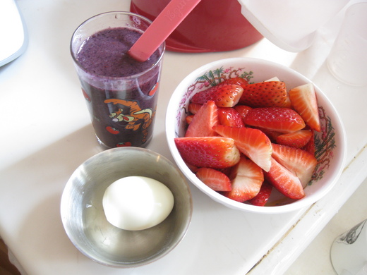 今天吃的跟昨天有些些不同,我加了一杯飲料.根據食譜用1/2杯的無糖杏仁牛奶和1杯的冷凍藍莓打成一杯約150c.c.的低卡奶昔,外加一碗草莓和一個白煮蛋就OK囉!