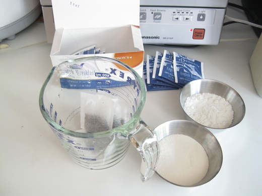 去年在亞馬遜購物網上發現有賣椰子口味的粉末,心想可以自己在家做椰香奶茶,隨時想喝就可以做,也比較省錢.因為它有附如何沖泡的方法,但是泡出來的味道跟外面賣的真的差很多(難喝),結果只泡過一次,剩下的就全放在廚房的櫃子.唉!本來是要省錢的,看來是不是反而浪費錢了呢?繼續看下去吧!)外子平均每週都會想喝一杯,所以自從上次試做失敗後,我們都去外面買.直到最近,大概是天氣回暖(真的蠻暖的,現在下午的溫度大約在28、9度)外子提起來再試試別方式,於是我們想到曾經買過一本<最受歡迎的100道飲品>,把它從廚房的櫃子中挖出來.試做一次發現跟外面賣的味道很相似(圖一有五包茶包、椰子粉、奶精還有糖,之前的敗筆是沒有加奶精,茶包的味道不夠),外子從此開始就想每天都喝一杯.