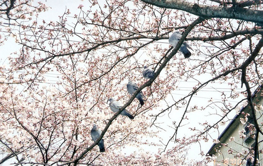 【圖片說明】(上)鴿子也成了哲學步道櫻花盛宴的賓客。(中)春櫻穿冬袍。(下)平安神宮的夜櫻與蒼松相映成輝 (大咪攝影)