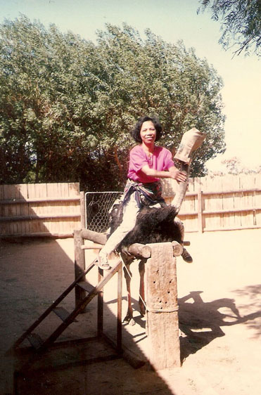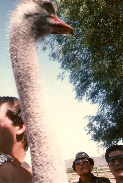 我們這個旅遊團一行三十幾人,非常壯觀,年紀青壯老年都有,大家都體力充沛,對每團只限八個人可試騎鴕鳥的約定甚不以為然,因為每個人都有興趣試試身手,我與姊姊也躍躍欲試。結果在實地觀賞過當地土著現場表演後,才知那是種高難度的玩意兒。鴕鳥力氣相當大,脾氣也大,是空手道高手,你想駕馭牠還得「抓」對部位,譬如脖子或翅膀的腋窩,即便是經常示範表演的工作人員也無法屢試成功,騎上鴕鳥後也只能跑上百公尺就適可而止,以免摔下來「漏氣」。至於初試身手的人,常都必須付出「慘痛」代價,可說稍一不慎就被擺平摔個四腳朝天,再被牠踹上一腳就更不得了。