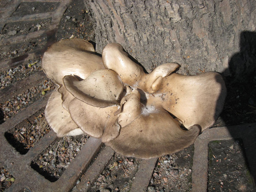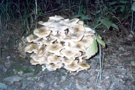 走著走著,發現一處突出地面的腐朽樹頭,周圍長滿了好大一圈的蕈體,看起來很像家鄉俗稱的「雞肉絲」菇,也就是蘑菇,若拔下來足有幾斤重。我不確定那是否可食的菇,於是先拔下一朵帶回去給