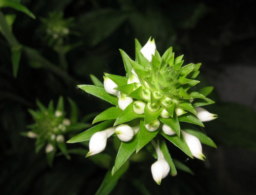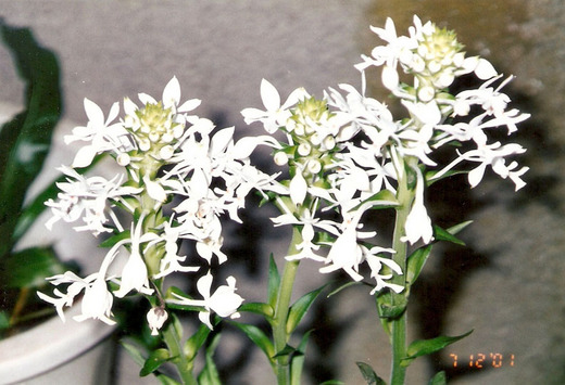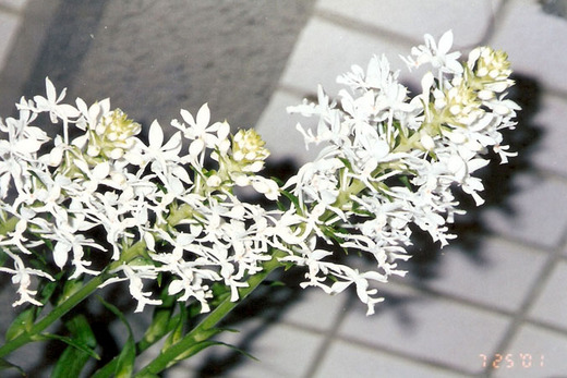 白色的小花只有拇指大,由三片花萼兩片花瓣組成一個頭冠似的小花帽,頭冠下一顆小小的蕊柱,像個小人頭。下來是一個類「大」字型的唇瓣,神似小人兒的手和腳。手與頭的「頸」間有一個橘色的小點點,像個領結一樣,整朵花的造型看起來就像個頭戴花帽的小人兒。發現它時,我們不知道它是什麼蘭草,事後也曾把拍下的花朵照片向植物專家請教,沒有得到確切的答案,因此我與先生便依花朵的樣貌為其取了一個「象形」名字--天使蘭,因為那些小小卻可愛有加的花朵,看起來實在太像畫片上在天空飛舞的小天使了。而最妙的是,我們幾乎可以認定它是「BOY」天使,因為那「大」字下的胯間還有一丁點的突起物,與小男孩的小雞雞真是太神似了。每根花莖上都有數十朵花蕾,從六月開始,小天使天天結伴來報到,每朵小花的生命可達