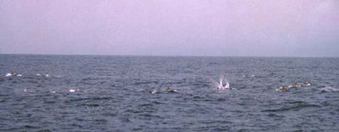 渡輪暫時靜止下來,讓大家盡情欣賞船週邊夢幻般的景色。此時海面微波蕩漾,卻不時濺起一波波白色的浪花,是海豚攪動的,成百上千,哦!不只,船東說得更誇張:「看樣子有成千上萬隻海豚正在這個海域活動哦!你們運氣真好!」