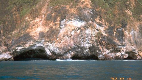 【照片說明】(下)龜山島沿岸的海蝕巖洞。(下下)岩壁下有海底溫泉湧出,使該處海水變成乳白色。