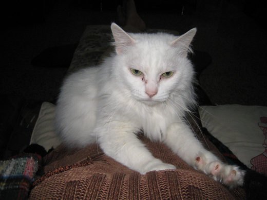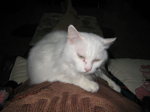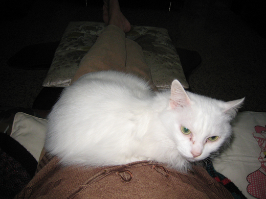 我家那隻大白貓喵喵已快五歲了,從外頭撿回來時還是隻乳貓,且奄奄一息,住過院挨過針,對「人」因此懷有深度戒心。不過畢竟我是牠的「奶娘」,跟我跟得很緊,簡直就是超級跟屁蟲,只是不肯讓我好好抱牠,每次想抱牠牠就張牙舞爪的,「恰」得很,幾次不能「得逞」後,我也懶得招惹牠了。