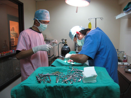 兒子在其學長處磨練三年後,年前自己在木柵開了家動物醫院,我這老媽自然不能「袖手」。也是直到在自家的動物醫院打工,才深深體會,做為一名動物醫生,還真得懷有十八般武藝。在動物電視頻道上,可以見識到國外極專業的動物醫師,在台灣,除了各大學獸醫系附設的教學醫院,有較為專科的門診,一般散佈在各社區的小型動物醫院,多半沒有分門別類,駐院醫師都算得上是「全能醫生」,寵物的「名堂」千奇百怪,貓犬兔子老鼠鳥類魚族蛇蜥蝪等都有人養來「玩」,他們也當動物醫生是全能醫生,任何寵物不對勁了,便會找上門來,也不管牠生的什麼病。