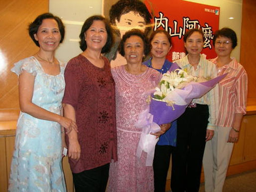 【照片說明】(上)寶瓶出版社為《內山阿嬤》新書發表會製作的大型看板。(下)阿嬤與兩個妹妹及兩個堂妹合影留念。(下下)六月的文友也來向阿嬤賀喜。(左起)六月、May、阿嬤、林少雯、俞金鳳、郭心雲合影留念。