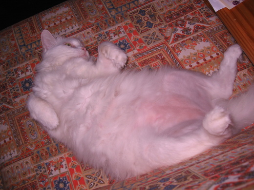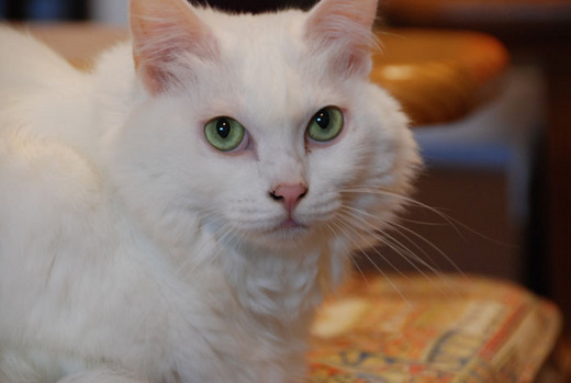 她長得真是漂亮,身體像一團雪球,兩眼則像兩顆晶亮的綠寶石,看到她的人都讚不絕口,問是何種「名牌」貓。她根本不是什麼貴氣的名種貓,圖鑑上找不到與她一模一樣的貓族,看來像是混有土耳其安哥拉種的米克斯(Mix)貓。不知是否自小進出醫院多次,對人老是懷著敵意,她不願意我們隨意撫摸她,總是與我們保持著安全距離,若要「強抱」她,必招她祭出尖爪利牙以對,恰別別,一副神聖不可侵犯的酷模樣。算了,就別去招她惹她,由她當孤寒幫主好了。
