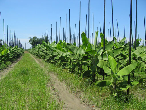 新植不久的蕉樹,旁邊樹立的竹竿做為防颱用。