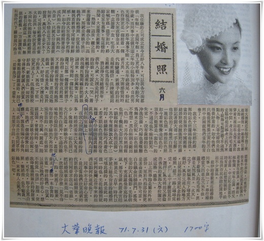 同事中不乏好奇心重者,最近當她們欣賞過新時代新娘子的結婚照後,不約而同要求我這「老娘」把結婚照拿出來亮「相」,我想也沒什麼「見不得人」的,便應了「觀眾」要求,把那一本珍貴的「古董」帶給她們「欣賞」,以滿足他們的好奇心,想不到竟「佳評」如潮,使我得重溫初披嫁衣時的甜蜜感。可不是?即令是黑白照,簡陋些,也不能說「她」未來的人生就不够「彩色」吧。