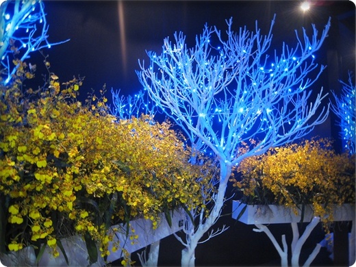 入口掀開水晶簾子,即如置身於藍紫色水底世界,身旁漂浮著數隻巨型花藝金魚,十萬顆水鑚與不同顏色的蝴蝶蘭排列出的水晶岩牆,讓空間更具強烈對比與層次感,側身其間,真有如夢似幻的不真實感。