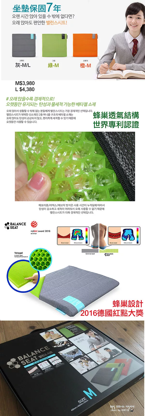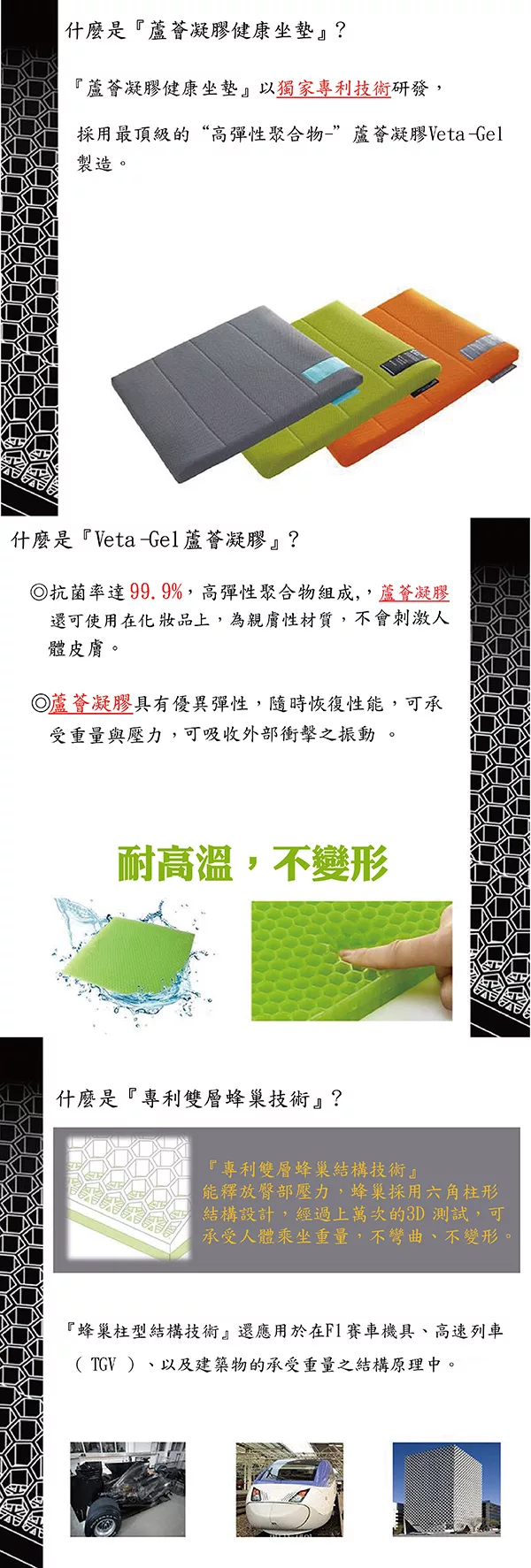 ●為每天坐8個小時以上的人所設計,車主、上班族、學生都需要『蘆薈凝膠健康坐墊』,越坐越舒適。