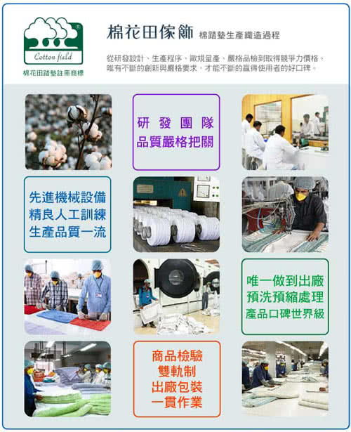 不論是市售百元款、千元款,都是經過嚴格生產過程織造。從棉花種植的土壤→施肥→人工細心呵護至收成→精選棉花等級→使用德國進口最新機器去殼、 清洗→嚴格精選優良人工車縫→品檢 →出貨。本公司長期使用印度ISO認證大廠開發設計與技術合作,讓台灣人也能使用到與世界同步最新花色及品質要求最高等級的高級棉質浴 (踏)墊。