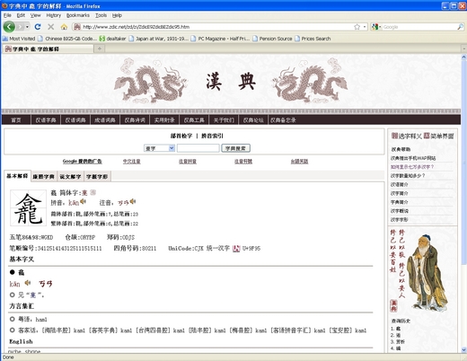 漢典是大陸的網站,優點不少.它列出每一個字的部首及筆劃,注音及漢語拼音;有五筆、倉頡、鄭碼的輸入碼;也有五角號碼及統一碼的編碼,另有粵語、客家話或其他方言的唸法.釋義方面,它除了有較簡略的解釋外,另有詳細解釋.此外,它還有康熙字典及說文解字的注釋,只要點一下,即可見到康字典及說文的注釋,非常方便.