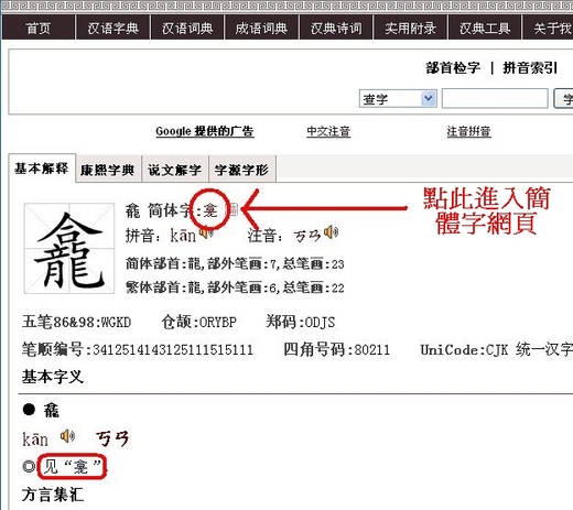對使用正體字者而言,它稍有不便.雖可輸入正體字查詢,但若有相對的簡體字時,它並不列出注釋,而是要見相對應的簡體字.例如查「龕」字,它的注釋是「见“龛”」.不過,這不是大麻煩.凡有相對應的簡體字,網頁上會有連結,只要點一下,即可進入簡體字網頁(見最下圖).