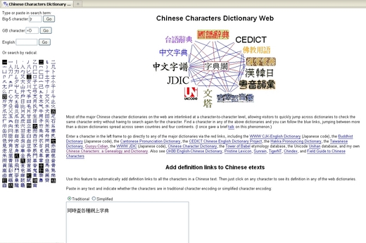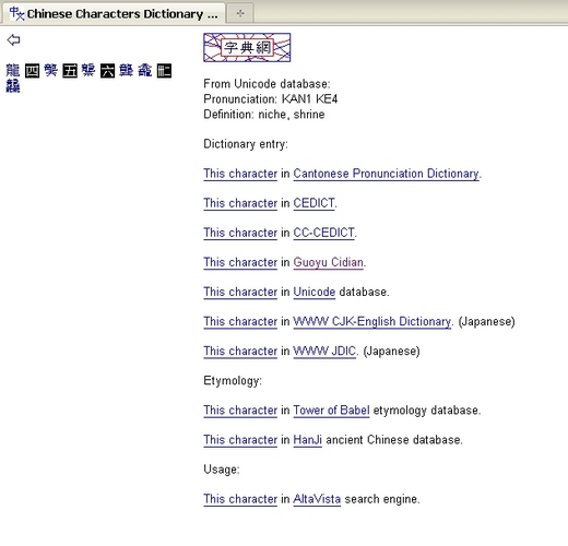 這是老外編的網站,中文(中文字譜)網站的一部份.特點是可同時查詢數個網站,很方便,故特別介紹.以下圖為例,查「龕」字,它顯現龕字在其他字典的連結,再也不必辛苦地一一到各網站分別查詢.當然,它所連結的字典有限.連結所無的字典,如康熙字典,說文解字等等,仍得躬身親查.