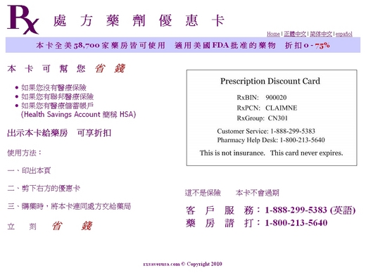 如何少付?請印出下面那張處方藥劑優惠卡.買藥時,連同處方拿給藥局,即可享受優惠.此卡完全免費,不必花錢即可省錢.請大家告訴大家,廣為宣傳,讓窮人鬆一口氣吧.你身邊若有開餐館的、打工的、失業的、或其他無保險的人,請給他們這張卡,讓他們少付點藥費,功德無量.
