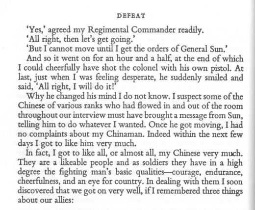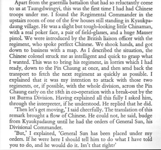 我這是首次統帥中國軍隊.彼時柏當僅有少數幾棟房子仍然直立,未被炸毀.我在其中一棟的樓上見到一一三團的團長.他表情嚴肅,帶著望遠鏡,配帶一把很大的手槍.我方的翻譯官中文很好,他介紹我與團長相識.我們握手之後,立即站到地圖前,研討戰情.當我描述戰況時,我查覺這位團長很聰明,很快就暸解我的要求,那就是立即乘坐我預備好的貨車,將整團運送到平川,然後貨車馬上回來載運下一團.我解釋道我要在十八日清晨以這兩個團-若有整個師更好-攻擊平川,以配合緬軍師突圍.解釋完畢後,我經由翻譯官問他是否暸解我的策略,他答道他懂得.