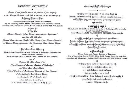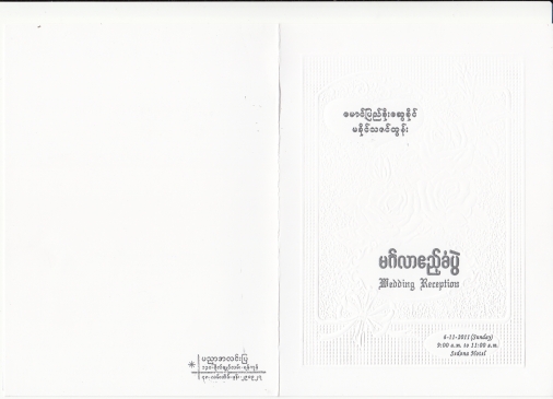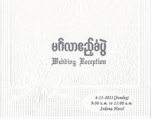 這是我首次見到緬甸喜柬。柬帖純白,燙以銀字,素淨簡潔,高雅大方。文字採英緬二式,左方英文,右方緬文。中國式請柬內容簡單,概言某人之子與某人之女於某月某日結婚,在某地請宴,備酌恭候。柬內僅提名姓,未加介紹,非熟識者,拿到請柬,恐怕會如丈二金剛般,摸不著頭。緬甸請柬則詳細多了。新郎新娘學位、畢業於何所大學、目前所任何職,皆詳列柬內。此外,父母頭銜職位也寫明。讀了喜帖,男女雙方的身家門第了然於心。