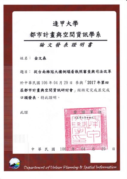 金文森(2015a)。違法建築之災害管理與司法縱容制度,2015物業管理暨防災國際研討會論文集(頁III-17~28),台北市:華夏科技大學。