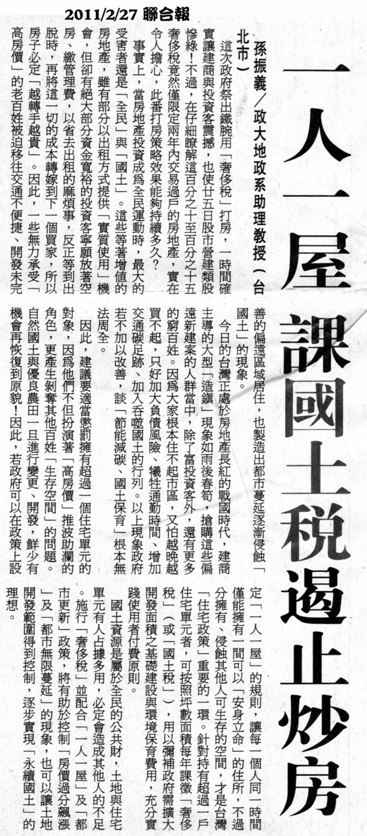一人一屋 課「國土稅」遏止炒房【聯合報╱孫振義/政大地政系助理教授(台北市)】