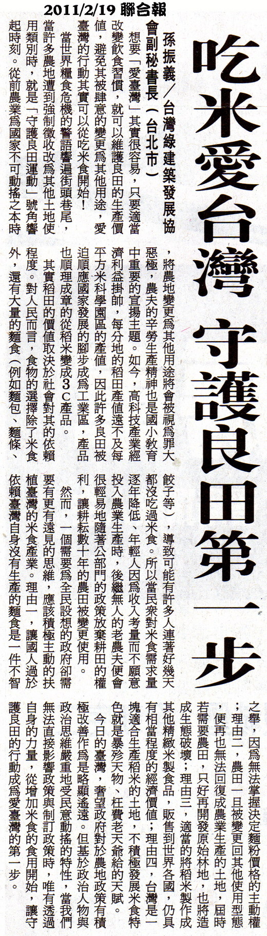 今日的臺灣,奢望政府對於農地政策有積極改善作為是略顯遙遠。但基於政治人物與政治思維嚴重地受民意動搖的特性,當我們無法直接影響政策與制訂政策時,唯有透過自身的力量,從增加米食的食用開始,讓守護良田的行動成為愛臺灣的第一步。