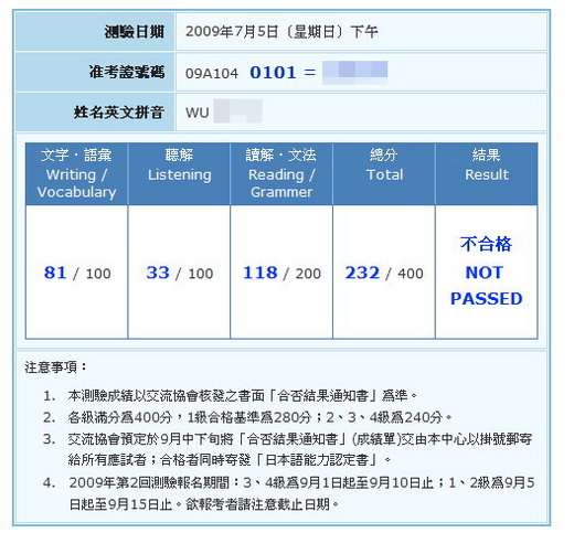 剛剛上網查詢,日語檢定7月5日的二級日語檢定考(JLPT)成績已經出爐了,這次依舊不及格,還真是無奈啊。