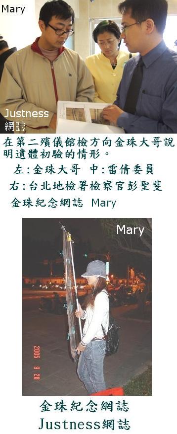 (註1:為找出究竟那位小姐是如何違法而須立即押離(因為警察至今始終沒說違法原因及理由) 因此試圖對照6/3與6/4 2天的警方執法情形後發現,那位小姐這2天的差別居然只在”是否手持國旗”。沒想到,在中華民國領土上,竟然容不下中華民國國旗?還是說國旗其實是違禁品?或許警政機關日後應要求立法並考慮發布一則公告:自即日起至年底,凡自動報繳國旗者,不沒入,不處罰。從此人民有所依從,也不會再迫使警察機關為了小小一面國旗,竟要如此大費周章了。) - 2樓. 金珠紀念網誌2006/06/07 20:32
