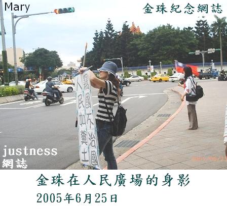 2006年6月,一個工人在台北市政府的露台上,赫然發現了一具已經死亡半年的女性乾屍。最後證實,她就是家屬報案失蹤已經半年的陳金珠。據說,警察初步已自殺結案。 因為荒謬的319槍擊案,和處處讓人質疑不公的選舉,很長的一段日子裡,每天下了班,她並不是回家,而是到總統府前的廣場去抗議。 憤怒和抗議的人是很多的。許多人都去了。 但抗議過後,在現實的冰冷撞擊後,每個人都明白了,保障掌權者的這個制度,不公平的司法,和在野政客的怯懦,使得現實幾乎沒有改變的可能。抗議行動一次次被冷卻,到最後被迫停止。 但即使在野的政黨不再抗議,她卻沒有停止追求公義。 她沒有停止,她有比絕大多數人更持久、更熱情的堅持。 對著抬頭就可以見到的總統府,她和一羣互不相識的人們,每天站在景福門圓環邊的人行道上,自動輪流,沉默的搖著國旗。 有人是早上來的,有人則在下午。他們很少說話,也沒有任何標語和口號。但是搖著國旗的沉默身姿,把對國家和民主的摯愛,說明得何其清楚。 他們只是專注的用雙手搖著巨幅的國旗,就逼得坐在總統府裡面的人,非得要每天看見這面他們痛惡的國旗。 沒有人要求他們來,沒有很多人感謝他們,甚至沒有多少人支持他們。有些在野的政客,把他們當成極端教義派,想辦法離得遠遠的;警察曾經把她抓到派出所,說她妨害交通。 被抓到警察局,必定給了她極大的羞辱,使她極度憤怒。而最後選舉官司和319槍擊案以荒謬和破綻處處的劇情結案,必定使她絕望。 但這樣的一個鬥士,是不可能用不留遺書,跑到市政府跳樓的方式自殺的。 做為一個國家的的主人,她是第一流的主人;雖然朝野政客,未必都配得上這樣堅持和勇敢的國民。 這樣一個女子,這樣一個頂天立地的國民。不管你支持哪一個政黨或政客,她都值得你用最深的深情,記得這樣的一個名字,陳金珠。