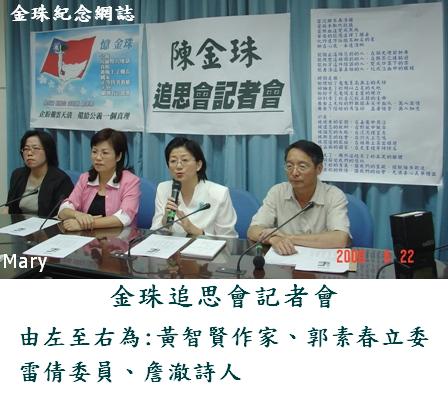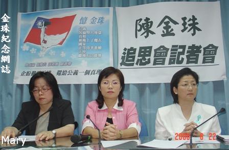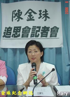 明天(0623日),我肉身雖不在台北,但我的魂魄一定會到金珠最後十九個月,守候國旗的地方,向這位普渡眾生(不包括政客)的菩薩致敬。南無阿彌金珠。 - 1樓. 金珠紀念網誌2006/06/22 15:34追念陳金珠 雷倩為她辦追思會