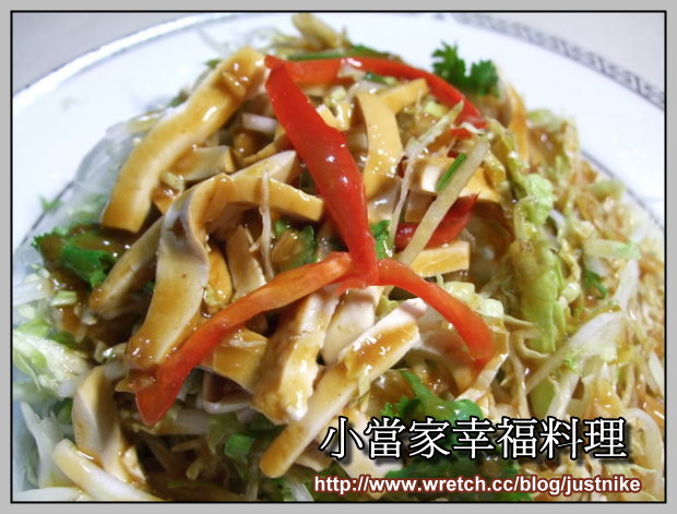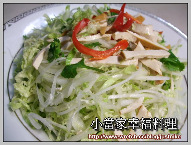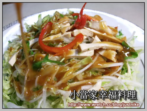 內容物有著山東大白菜、辣椒、豆干、香菜與附上一份醬料類似油醋醬..