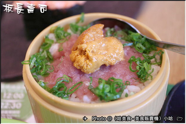 海膽搭上蔥花粒搭上鋪滿了鮪魚魚腹肉上,是不錯吃,