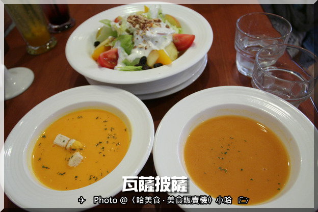 先看到沙拉一份與湯品兩份,湯品: 南瓜湯與義式蔬菜湯。單點65元。